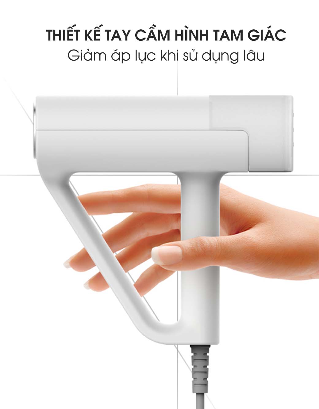 Bàn ủi hơi nước cầm tay DEERMA HS100 được thiết kế chỗ tay cầm hình góc vuông, vận dụng nguyên lý hình tam giác để giữ sự ổn định, cho cảm giác cầm thoải mái, đồng thời giúp tiết kiệm sức lực. Trọng lượng của bàn ủi chỉ 0,7kg.